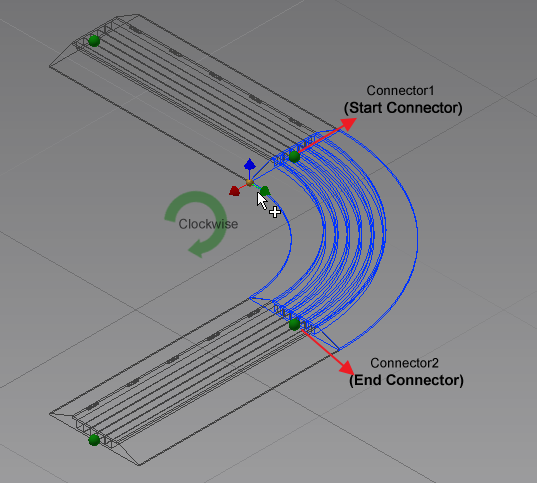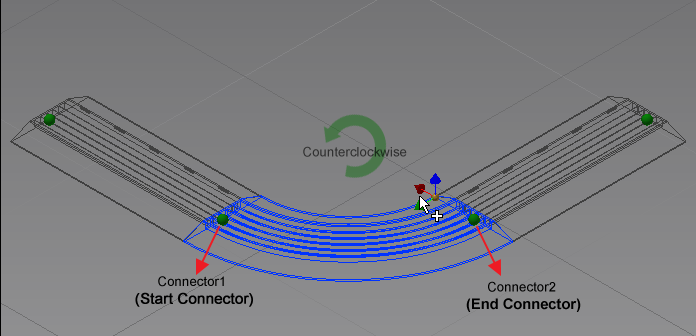 It is important to correctly specify the start connector and end connector of an Arc Turn segment. Doing so determines the proper curve direction of chains when the 2D segments are connected together and populated with 3D assets in Inventor Factory. By default, the arc turn segment defined for an asset chain curves in a clockwise direction (right turn).