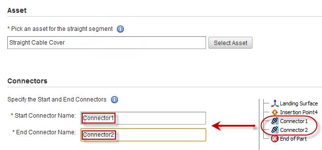 Tip: You can open the corresponding asset in Inventor and copy the connector names from the
