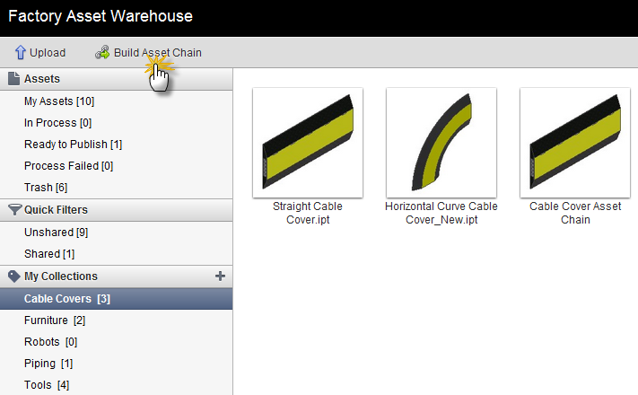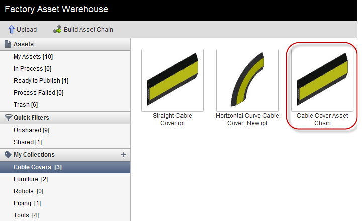 All models to be used for straight and turn assets must already be uploaded to the Factory Asset Warehouse server, either from the Asset Builder within Inventor Factory, or from the Factory Asset Warehouse web site. Once your asset models are uploaded to the Factory Asset Warehouse, they are available to be selected as the segments of the chain.