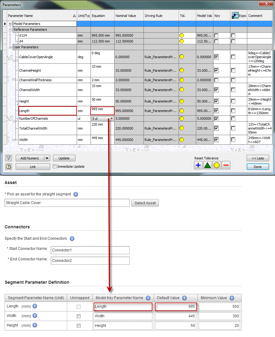 - Length1 - The Segment Parameter named "Length1" stores the value of the Model Key Parameter called "Length1" which represents the length of the turn asset on the side of the first connector. This important value is used to divide the asset chain into segments of the proper length and must be mapped. When populating the 2D asset chains with their Inventor 3D equivalents, the Model Key Parameter called "Length1" receives the value of the Segment Parameter named "Length1" to create Inventor asset components.