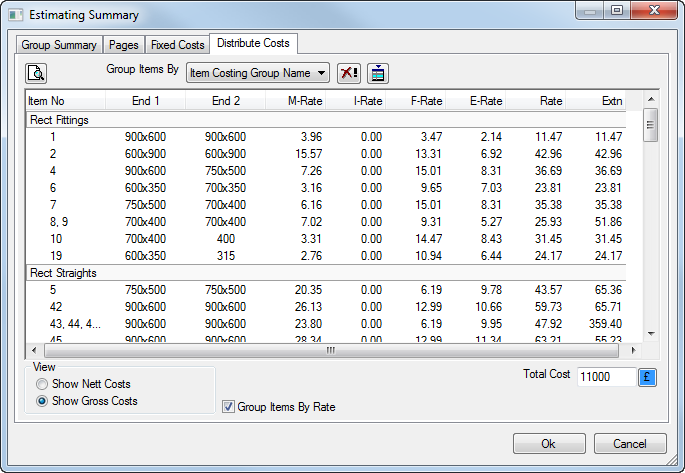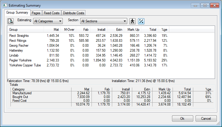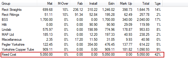 As shown below, the Costing Group is broken down into Supplier Names and default Costing Groups assigned automatically from manufactured items. Rect Straights and Rect Fittings are pre-defined by default, whereas the Manufacturer names (Georg Fischer, Hattersley, Lindab etc) come from the Item Price List assignment Supplier Name field.