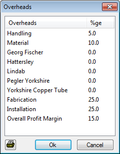 - The Overheads icon allows access to the various percentages preset in the Costing Database