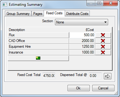 Fixed Costs can be allocated to the quotation from the Fixed Costs tab of the Estimate Summary. Users are able to specify existing Fixed Costs, which are created and preset from the Costing Database