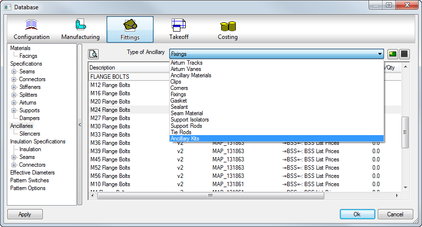 - Create each ancillary required for inclusion into the kit under the relevant Ancillary type heading. For example: Fixings, Clips or Ancillary Materials if length based for example. Accessed from the database Fittings
