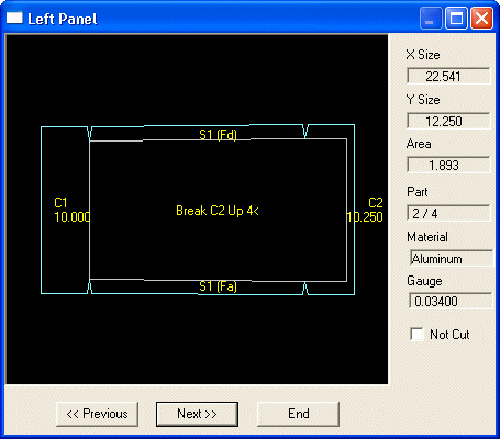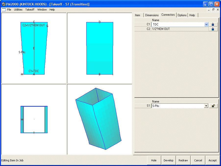 From the development it is also possible to see that the notch is not correct at either end. It should be accepted that the drawing office knows nothing about notches and when we later open the job with the manufacturers database this will be corrected. It is also unlikely the drawing office knows the exact seam allowances, own metal allowances, etc. Before progressing the user should note the exact names of all the specifications, materials, connectors and seams that the drawing office has used.