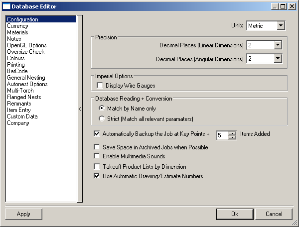 If a job is opened using the manufacturers database (XXX.MAJ), all attributes used by the items will be compared with the entries in the manufacturers database. What happens then is dependent on the Database Reading + Conversion settings in the Configuration Tab found in the Database editor.