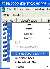 Important Note: Items passed from CAD to CAM have stored with them the developments associated with the CAD attributes and pattern options. Select all Items and Right Click choosing Change Specification(s) > Click OK. This is a quick method to ensure that the items are re-developed and use the attributes associated with the current specification assigned to each Item. Editing each Item separately has the same affect. Remember if the original specification name assigned to each item matches the specification name in the database, the data will be used, however locked connectors or seams will not be changed.