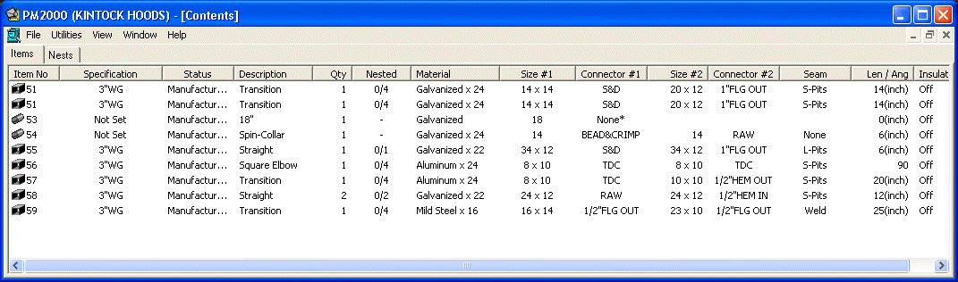 Using CAM-Duct, open the Job and arrange the Job Contents columns as shown above. Remember this uses the drawing offices database, so the specifications, material, connectors, seams and insulation names and allowances are all unconfirmed and may be wrong.