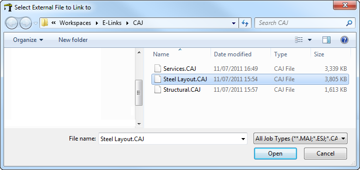 - The user will be presented with a "Select External File to Link to" dialog, at this stage navigate to the required model, please note various model formats can be utilised refer to E-. Select "Steel Layout.CAJ" then "Open" to proceed.