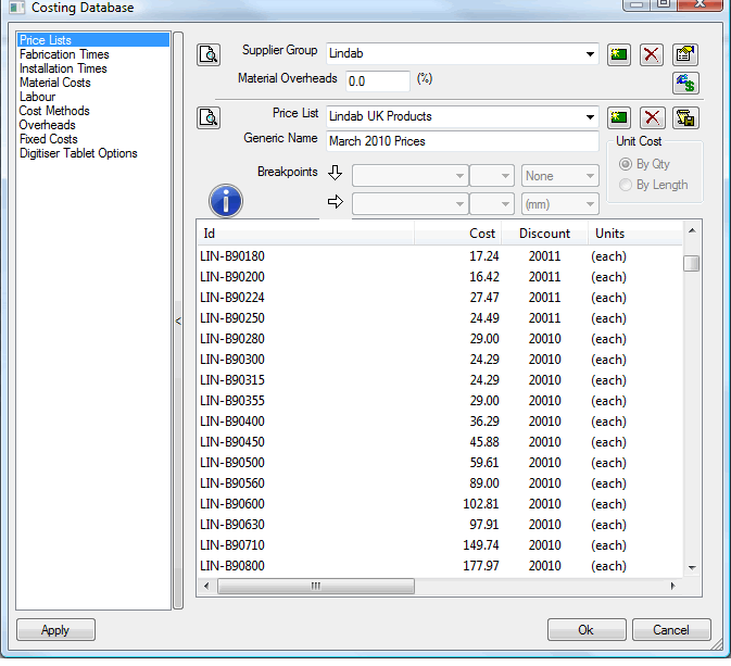 Material Overheads: Percentage value entered here will apply across all codes and increase prices. Generally used for markup of the supplier. The Cost field is the list price generally imported from the supplier spreadsheet. This is geiven a discount code to give the nett cost. The nett cost is then increased by the material overhead and could potentially further increase using profit margin.