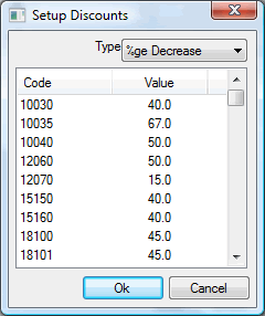The Right Clicking of code entries in the Price List also gives the option to assign Discounts. Multiple items can be selected at once using SHIFT and Right Click methods and also holding CTRL and Right Click to select individuals. The Discount codes available here are those configured from the Setup Discounts dialogue explained earlier in this topic.