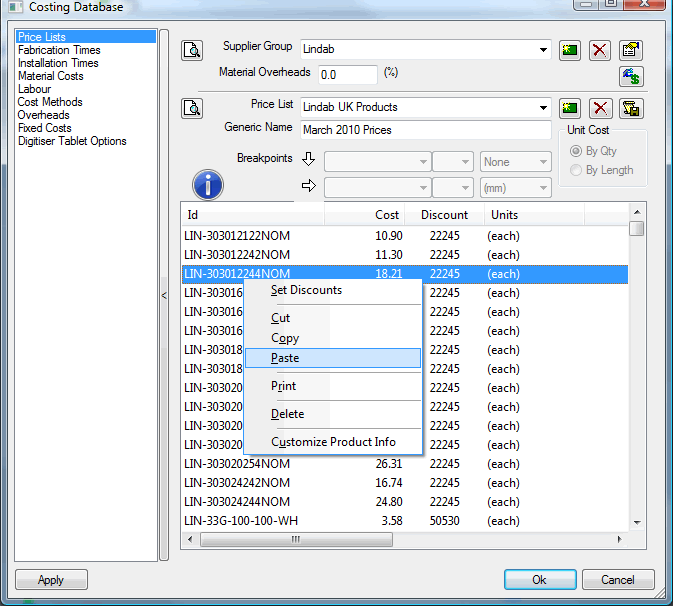 In place of importing from CSV. The ability to copy the column from a spreadsheet application is available. Copying the columns of data from the like of Excel and then Right Clicking > Paste in the Price List dialoge shown below enables the same functionality as importing through CSV. The mapping dialogue is displayed and the help from this point explained above should be followed.
