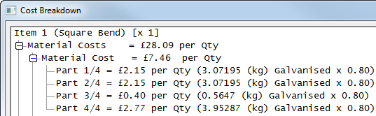 The example below shows a Square Bend material cost breakdown. The weights shown are for each development prior to wastage application.