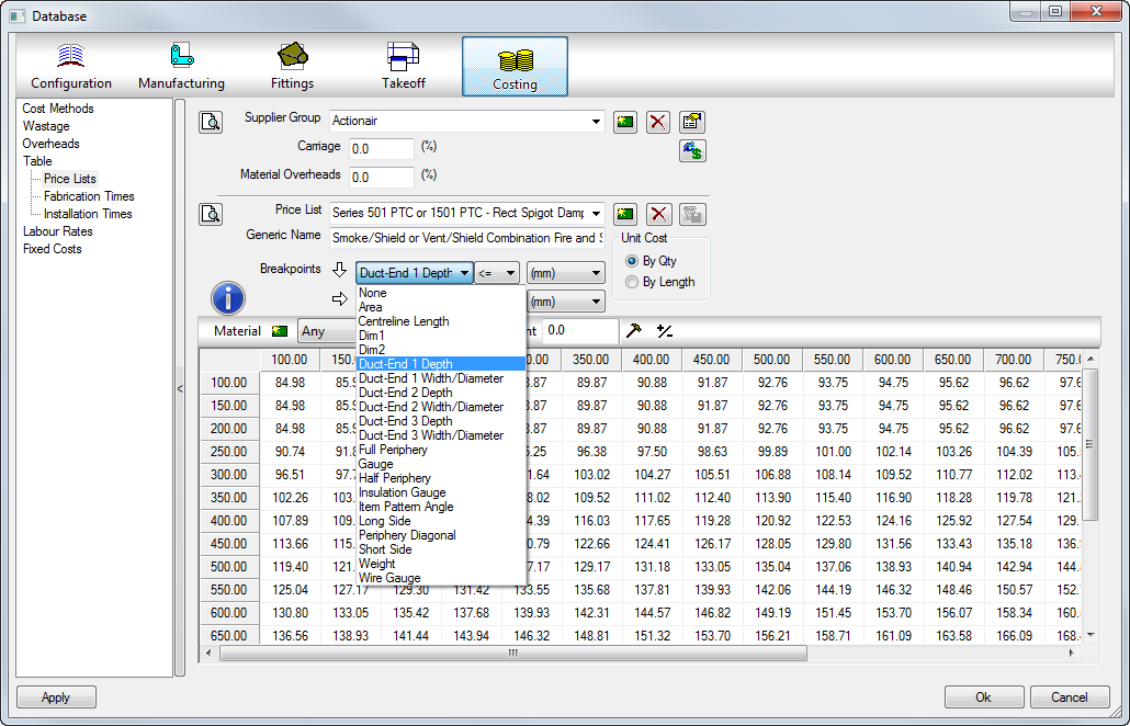 Long Side: Items being taken off that have this price list assigned will reference against their Longest side for pricing. 600x400 duct would use the 600 side to lookup values for price.