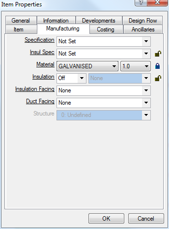 The Item Properties dialogue allows the user to set Materials, Quantities, Specifications, etc to a part drawn or modified in Opus.
