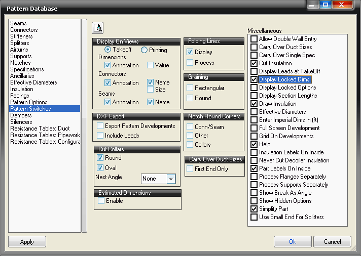 - Click File >Setup > Pattern Database > Pattern Switches or select the Pattern Database icon from the Utility Bar, in the Miscellaneous field tick the Display Locked Dims option.