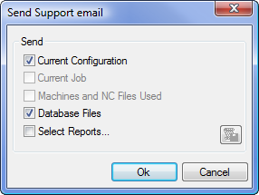 - Under Send, check that Current Configuration, Current Job, Machines and NC Files Used and Database Files tick boxes are all ticked. If the query relates to reports or labels, please additionally Select Reports and click the option to the right to select the reports in question.