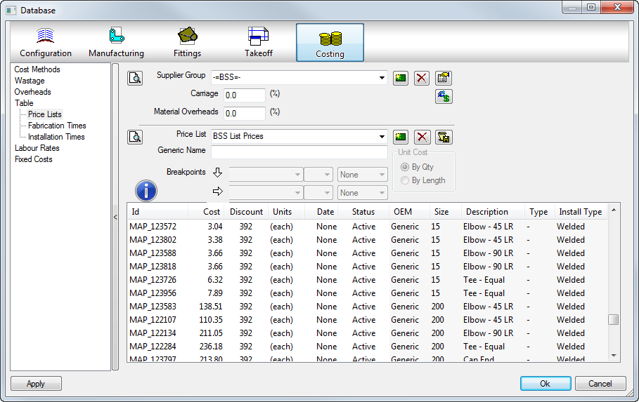 The default installation comes loaded with multiple price lists from variant suppliers. Lindab, BSB, Actionair, BSS, Wolseley Group, Georg Fischer, Pegler, Crane, Hattersley etc. allowing for the user to apply their own agreed discount percentages.