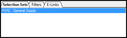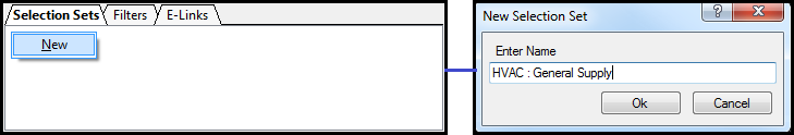 - With all the items highlighted within the "General Supply" service, the utilisation of "Selection Sets" can be created. Click on "Selection Set" tab. Right click within the dialog box below, Select "New", a "New Selection Set - Enter Name" dialog will appear. Title as required "HVAC : General Supply", Select "OK" to finalise the command.