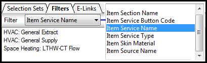 - Select within the "Workspace" toolbar "Filters". From the drop down menu select "Item Service name", the dialog will populate all the active services contained within the model. Note as default the "Filter" is set to "None".