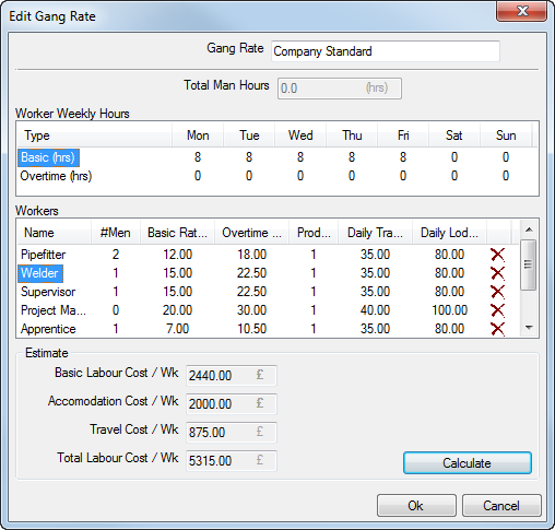 The User can enter a standard hourly rate for each of the skills generated in the Installation Rate tables or they can collectively group installation, based on a Gang Rate calculation.