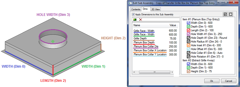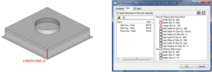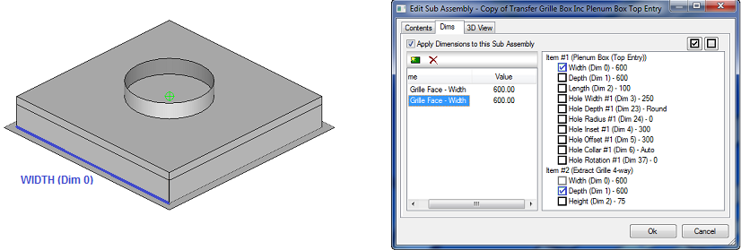 - To link the dimensions for "Width (Dim 0)" for "Item #1" & "Item #2", by selecting the box in each field, a tick will appear. This indicates the two items within the sub assembly are now being driven by one common dimension for width - (Dim 0) titled "Grille Face - Width".
