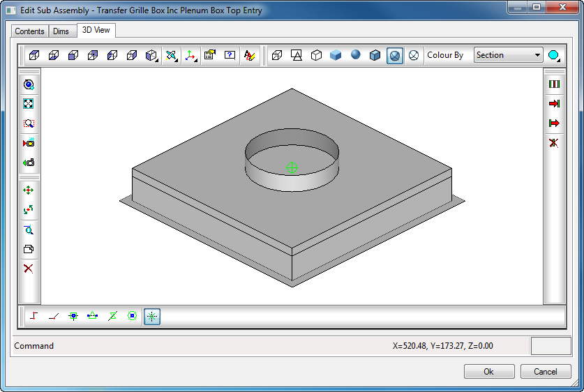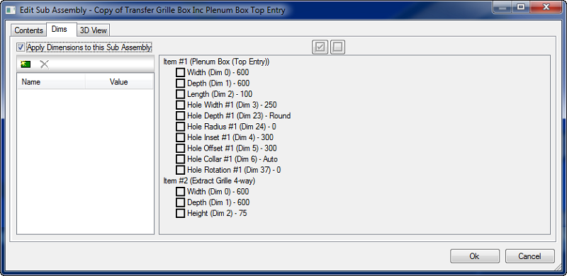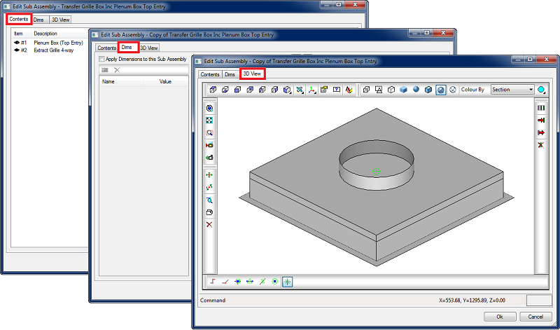 As illustrated above, the dialog is categorised into three individual tabs, these consist of : "Contents Tab", "Dims Tab" & "3D View Tab". For additional information and functionality, please refer to Sub-Assemblies - Toolbar/Commands documentation.