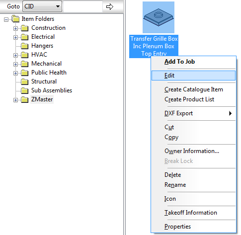 - Plan the required items to be combined as a dynamic sub assembly. Illustrated below a generic example of a "Transfer Grille", with a "Top Entry Plenum Box". To insert the items into the model, Select within the active Service Template or folder structure , then position individually within the model accordingly.