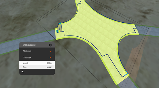 Select a turn lane and drag the Add Widening manipulator to create a Widening Zone. Select a Widening Zone to display its asset card.