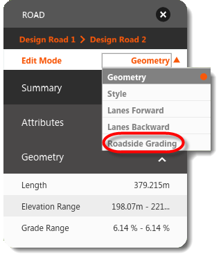 Users can specify whether to use a Fixed Slope or Fixed Width grading method to determine how a road's roadside cross-slope is graded.