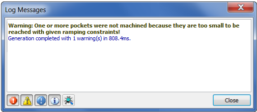 In the image below, the 2D Pocket operation cannot clear all selected areas because there is not enough room for a ramp with the given settings.