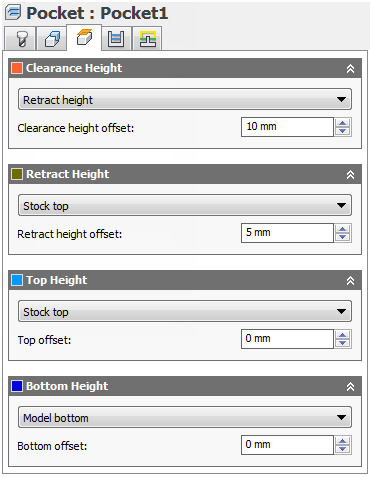 Retract height mode sets the height that the tool moves up to before the next cutting pass. Retract height mode should be set above the Feed height and Top. Retract height mode is used together with the subsequent offset to establish the height.