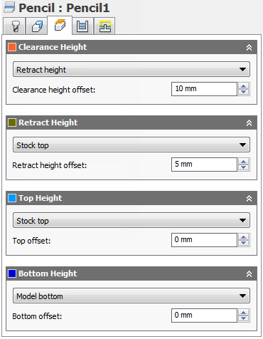 Retract height mode sets the height that the tool moves up to before the next cutting pass. Retract height mode should be set above the Feed height and Top. Retract height mode is used together with the subsequent offset to establish the height.