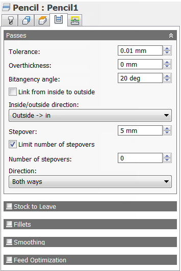 The Pencil strategy creates toolpaths along internal corners and fillets with radii smaller than or equal to the tool corner radius. By applying an Overthickness, it is also possible to calculate pencil paths along fillets that have a larger radius than the tool corner radius.