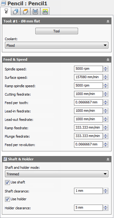 When using a tool with a holder, you can choose between one of five different shaft and holder modes, depending on the machining strategy. Collision handling can be done for both the tool shaft and holder, and they can be given separate clearances.