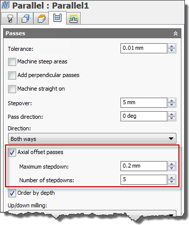 Axial offset passes work much like multiple finishing stepdowns in the 2D operations and are useful for removing a fixed amount of stock in several steps. As an example, if you have 1 mm of stock left you can remove this in five passes of 0.2 mm using parallel finishing.