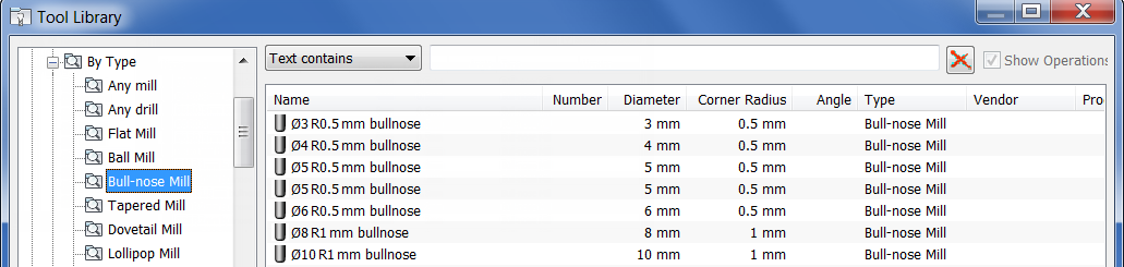 For example: By selecting the By Type > Bull-nose Mill folder, only the bull-nose tools are shown.