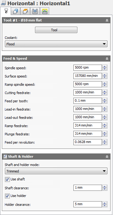 When using a tool with a holder, you can choose between one of five different shaft and holder modes, depending on the machining strategy. Collision handling can be done for both the tool shaft and holder, and they can be given separate clearances.