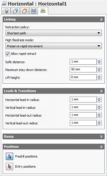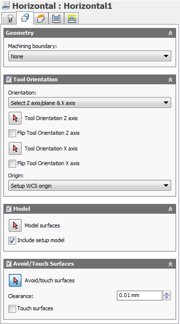 For surfaces that are not exactly horizontal, Inventor HSM interpolates between the axial and radial (wall) stock to leave values, so the stock left in the axial direction on these surfaces might be different from the specified value depending on surface slope and the radial stock to leave value.