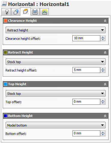 Bottom height mode determines the final machining height/depth and the lowest depth that the tool descends into the stock. Bottom height mode needs to be set below the Top. Bottom height mode is used together with the subsequent offset to establish the height.