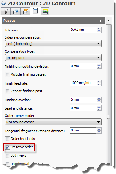 To manually control the ordering, select the individual contours in the order in which they should be machined and enable the Preserve order check box on the Passes tab.