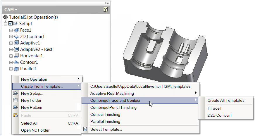 A new operation is created from a template using the Create from Template menu entry also available in the CAM Browser pop-up context menu. All templates stored in the last selected template folder are automatically listed under this menu entry. As shown in the image below, composite templates are listed as submenus allowing you to easily create either operations for all operation templates (Create All Templates), or from individual operation templates.
