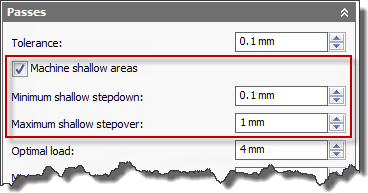 Shallow area machining detects shallow areas on the model and inserts additional stepdowns to provide a better finish of the shallow areas.