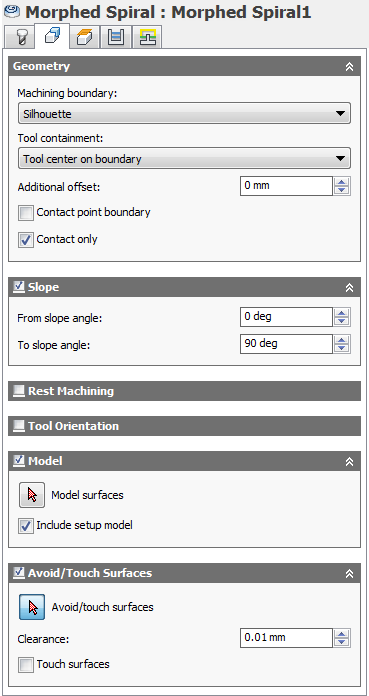 The Morphed Spiral strategy is very similar to the Spiral strategy. However, a Morphed Spiral operation generates the spiral from the selected boundary as opposed to a Spiral operation which trims the generated passes to the machining boundary. This means that Morphed Spiral can be used for additional surfaces for which Spiral is not appropriate.