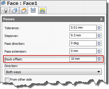 The Face strategy allows you to specify an additional offset for the automatic or manual stock contours by means of the Stock offset setting.
