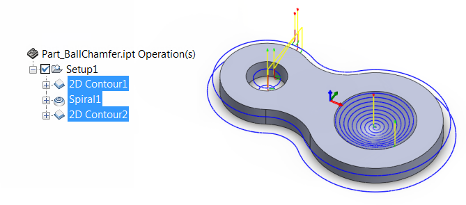 Inventor HSM supports chamfering with ball end mills and bull end mills. This may be useful in cases where you are already using a ball or bull end mill in a part and wish to chamfer off sharp edges, but save a tool change to an ordinary chamfering tool. With small chamfer sizes, the differences between a flat chamfer using a chamfering tool and a slightly rounded chamfer may be negligible.