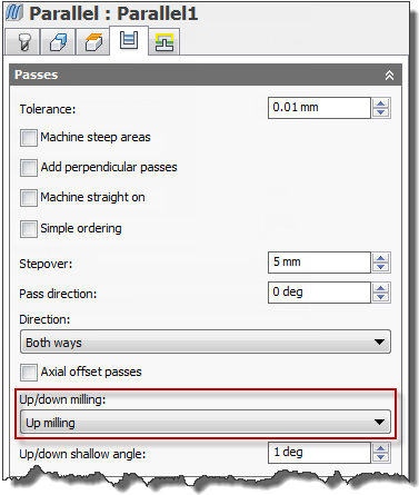 Machining strategies like Pencil, Scallop, Parallel, Radial, and Spiral produce toolpaths that move up and down in Z. Depending on the tools used, you might prefer to only do down milling or up milling. Inventor HSM lets you control this on this Passes tab with the Up/down milling drop-down menu.