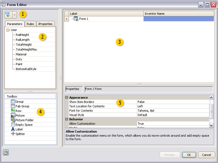 TabsDrag and drop items from the tabs to the Form design tree to add controls on the user interface design. Only existing parameters and rules display on the tabs.