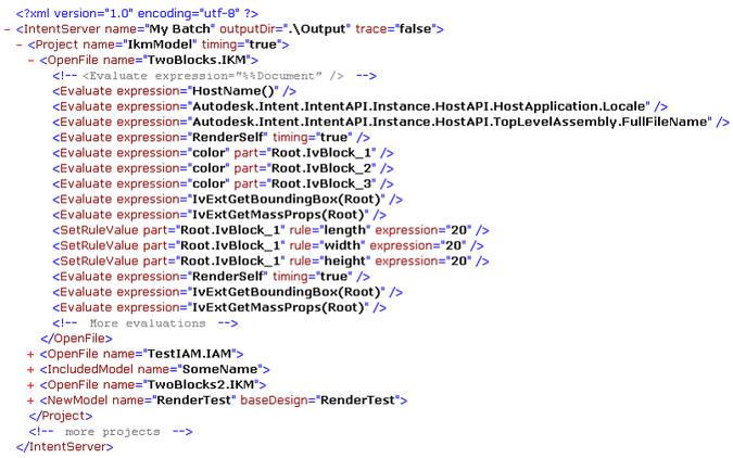 The XML root element is <IntentServer >. The children element, <Project > specifies the Inventor project contexts in which the model runs.