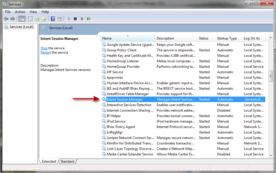 After installing, confirm that Intent Session Manager Windows Service is running by checking Administrative Tools->Services: